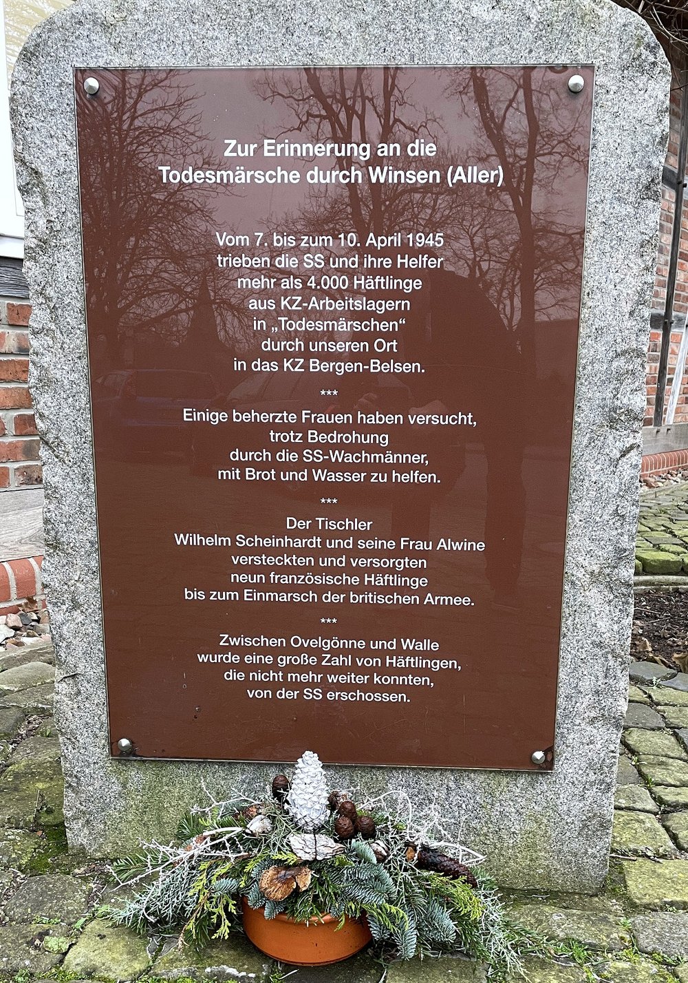 An die Todesmärsche durch Winsen (Aller) erinnert seit dem 6. April 2014 eine Gedenktafel am Niefindthaus.