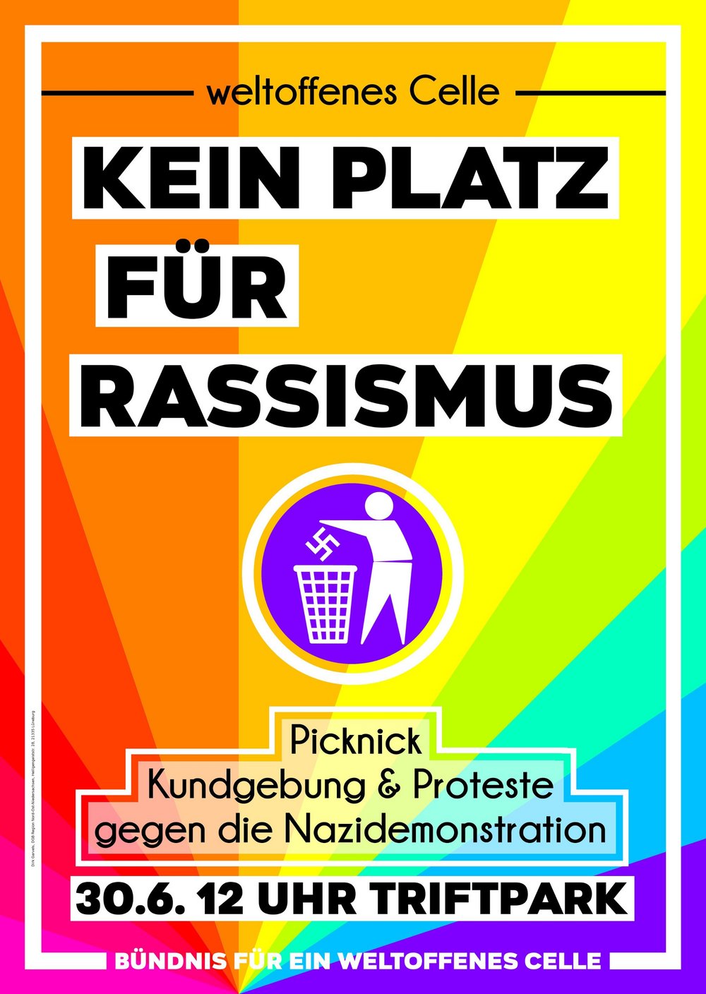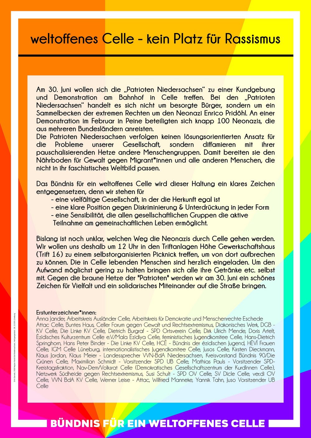 Weltoffenes Celle – Kein Platz für Rassismus! Am 30. Juni wollen sich die „Patrioten Niedersachsen“ zu einer Kundgebung und Demonstration am Bahnhof in Celle treffen. Bei den „Patrioten Niedersachsen“ handelt es sich nicht um besorgte Bürger, sondern ein Sammelbecken der extremen Rechten um den Neonazi Enrico Pridöhl.