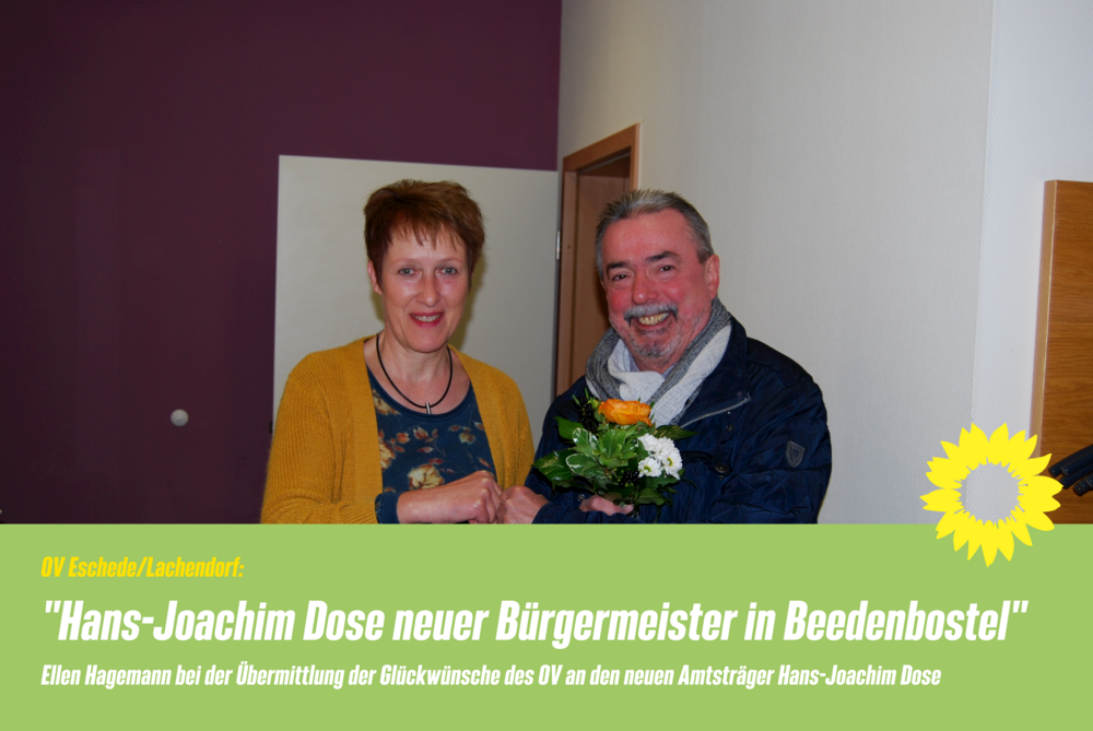 Der Ortsverband Lachendorf-Eschede und der Kreisverband von Bündnis90/Die Grünen Celle freuen sich über die Wahl von Hans-Joachim Dose zum Bürgermeister der Gemeinde Beedenbostel. Er setzte sich in der konstituierenden Sitzung des Gemeinderates am 03.11.21 gegen Jörn Stradtmann (UB) mit fünf zu vier Stimmen durch und löst den bisherigen Bürgermeister Kuhls ab, der nicht wieder zur Wahl antrat.