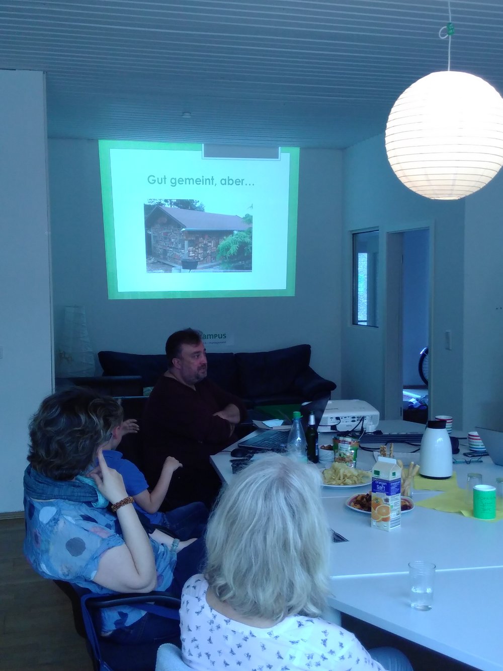 Thema war diesmal „Nisthilfen für Wildbienen“. Stephan Ohl erläuterte, wie wichtig die Kenntnis der Ansprüche der Wildbienen ist, denn nicht jedes sogenannte „Insektenhotel“ ist für sie geeignet.