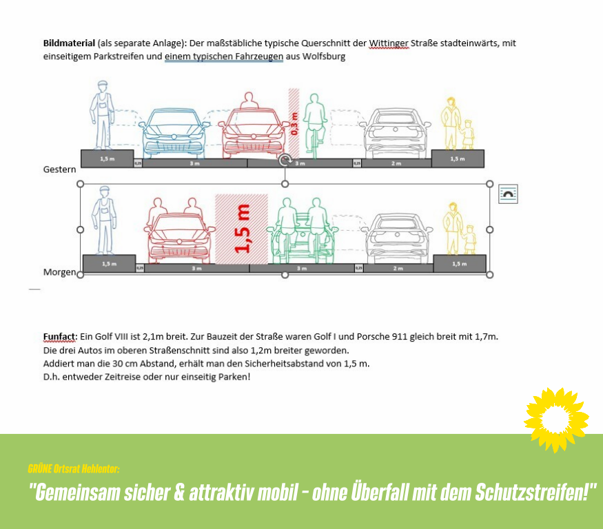 Bildmaterial (als separate Anlage): Der maßstäbliche typische Querschnitt der Wittinger Straße stadteinwärts, mit einseitigem Parkstreifen und einem typischen Fahrzeugen aus Wolfsburg
