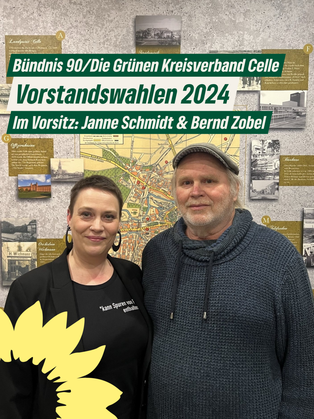 Janne Schmidt und Bernd Zobel heißen die wieder gewählten Vorsitzenden des Celler Kreisverbandes von Bündnis90/Die Grünen. Auf einer gut besuchten Mitgliederversammlung wurden die beiden Celler mit großer Mehrheit gewählt. In ihrer Bewerbung betonte Janne Schmidt insbesondere „ die Bedeutung der bevorstehenden Europawahlen und die Einbindung der neuen Mitglieder in das Parteileben“. Bernd Zobel sieht in „der Auseinandersetzung mit dem Rechtsextremismus und der völkisch nationalistischen AFD“ eine Herausforderung und Aufgabe in den nächsten Monaten.