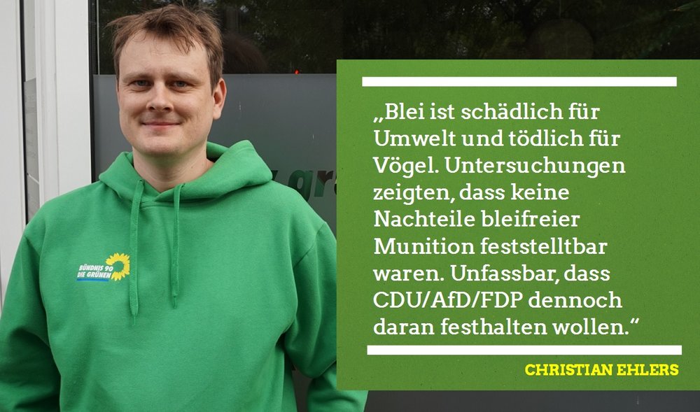"Nun wollen wir als GRÜNE im Kreistag keine Bundespolitik machen. Wir machen uns aber Gedanken, ob der Eintrag von Blei in unserem Landkreis reduziert werden kann und dadurch unsere Böden und seltene Greifvögel geschützt werden können.", so der Winser Christian Ehlers bei seiner Rede im Celler Kreistag.