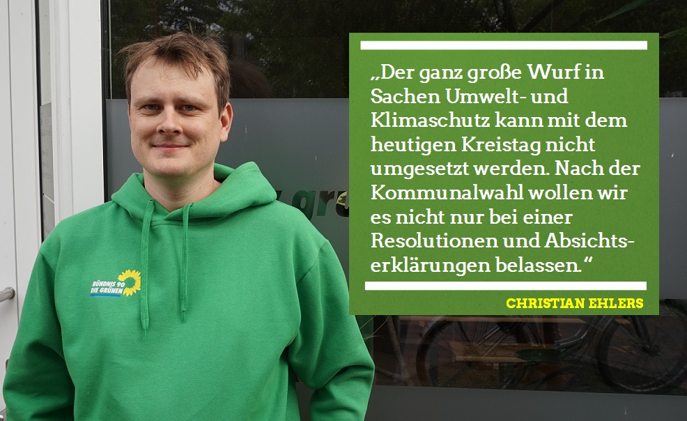 "Da der Kreistag mehrheit für diesen Doppelhaushalt stimmte, haben wir uns bereits heute den Herbst 2021 als Beginn für Haushaltsberatungen im Kalender markiert. Mit geänderten Mehrheitsverhältnissen im Kreistag nach der nächsten Kommunalwahl wollen wir umweltpolitische Schwerpunkte im Haushalt setzen und über einen Nachtragshaushalt entsprechende finanzielle Mittel einstellen. Der ganz große Wurf in Sachen Umwelt- und Klimaschutz kann mit dem heutigen Kreistag nicht umgesetzt werden. Nach der Kommunalwahl wollen wir es nicht nur bei einer Resolutionen und Absichtserklärungen belassen, sondern vor Ort handeln und den finanziellen Rahmen über den Nachtragshaushalt zur Verfügung stellen.“, so der finanzpolitische Sprecher der GRÜNEN, Christian Ehlers.