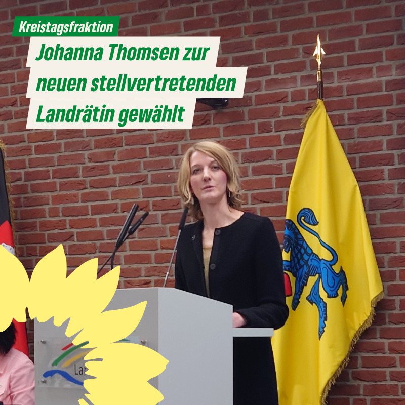 Infolge der Fraktionsneubildung unserer Kreistagsfraktion wurde der Kreisausschuss neu besetzt. Damit einhergehend erfolgte auch die Neubesetzung der stellvertretenden Landrätin. Im zweiten Wahlgang setzte sich Johanna Thomsen (GRÜNE) gegen Jörn Schepelmann (CDU) mit 30 zu 24 Stimmen durch.