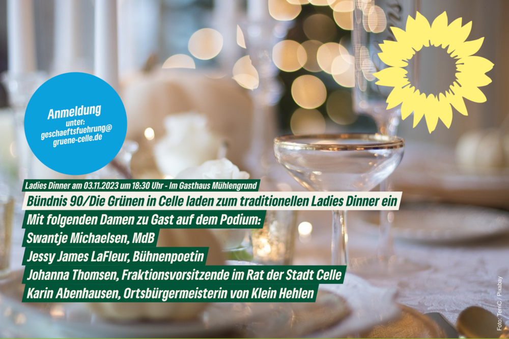 Am 03.11.2023 um 18:30 Uhr ist es wieder soweit: Bündnis 90/Die Grünen in Celle laden zum traditionellen Ladies Dinner in das Gasthaus Mühlengrund in Wienhausen ein. Thematischer Schwerpunkt wird in diesem Jahr “Weibliche Perspektiven in Politik und Gesellschaft” sein.