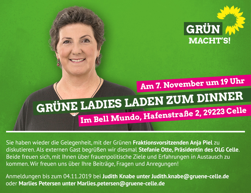 Anmeldungen bis zum 04.11.2019 unter Judith.knabe@gruene-celle.de oder Marlies.petersen@gruene-celle.de.
