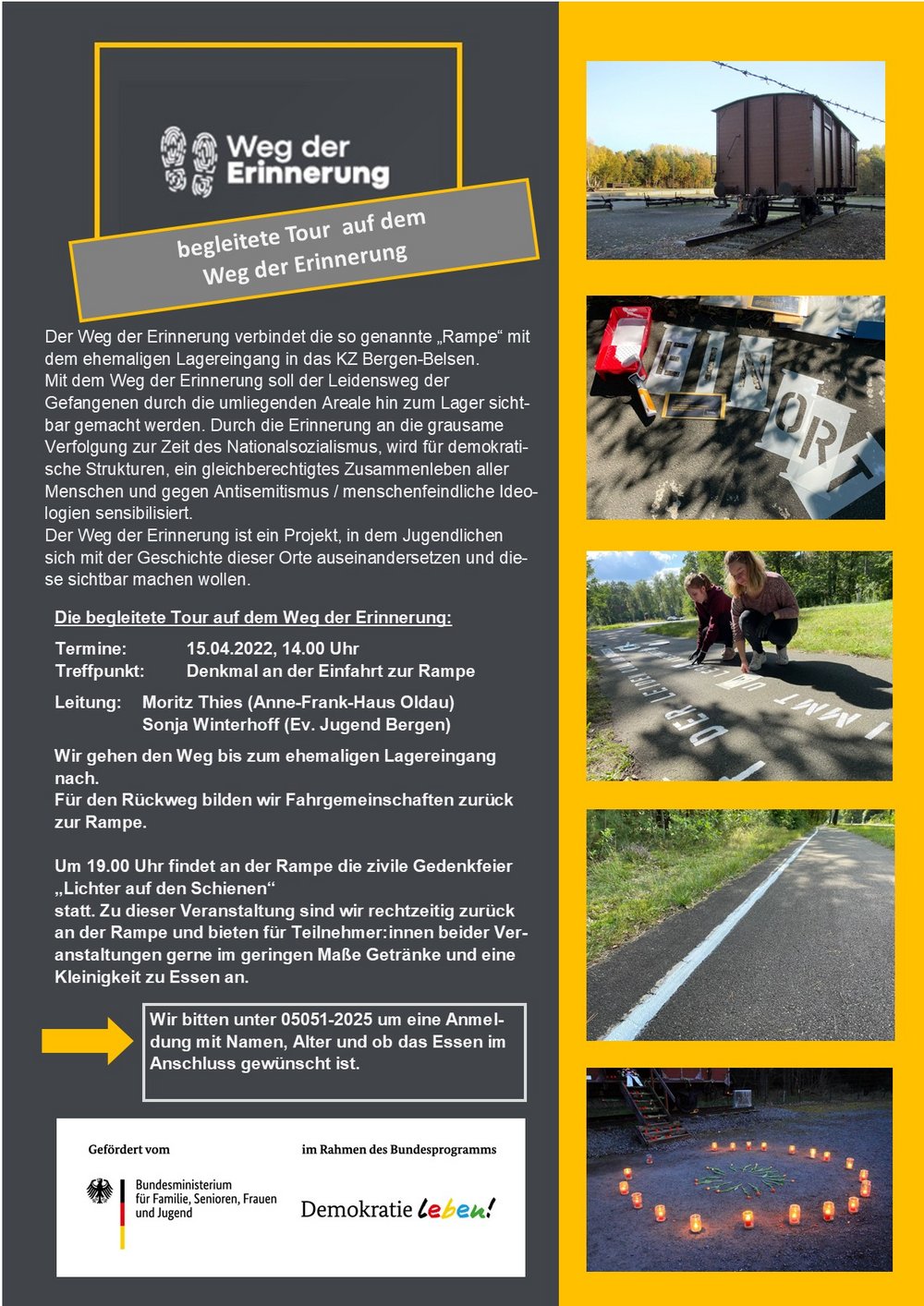 Am 15. April 2022 um 14.00 Uhr bieten Sonja Winterhoff (Ev. Jugend Bergen) und Moritz Thies (Anne-Frank-Haus Oldau) eine begleitete Tour entlang des Weges von der „Rampe“ bis zum ehemaligen Lagereingang an. Der „Weg der Erinnerung“ verbindet die „Rampe“ am Südrand von Bergen mit dem ehemaligen Lagereingang in das KZ Bergen-Belsen. Auf diesem Weg wurden tausende Häftlinge in das KZ Bergen-Belsen getrieben - für 20.000 sowjetische Kriegsgefangene und 50.000 KZ-Häftlinge gab es keine Rückkehr. Der „Weg der Erinnerung“ ist ein Projekt von Jugendlichen, die sich mit der Geschichte des Ortes auseinandergesetzt haben und an vier Stationen mit Berichten von Zeitzeugen daran erinnern wollen.