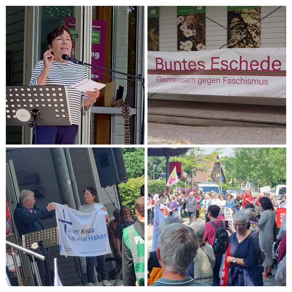 Über 300 Menschen demonstrierten am vergangenen Samstag in Eschede gegen die AfD und Neonazis. Zentrale Forderung war „Schluss mit den Nazitreffen“ auf dem Hof Nahtz. So hatten sich dort am letzten Wochenende wieder 50 Neonazis anlässlich ihrer Sonnenwendfeier getroffen. Viel Beifall erhielt auf der Kundgebung am Bahnhof die Gastrednerin Margot Käßmann. Aus verschiedensten Orten des GRÜNEN Kreisverband nahmen etliche Mitglieder an der Protestaktion teil.