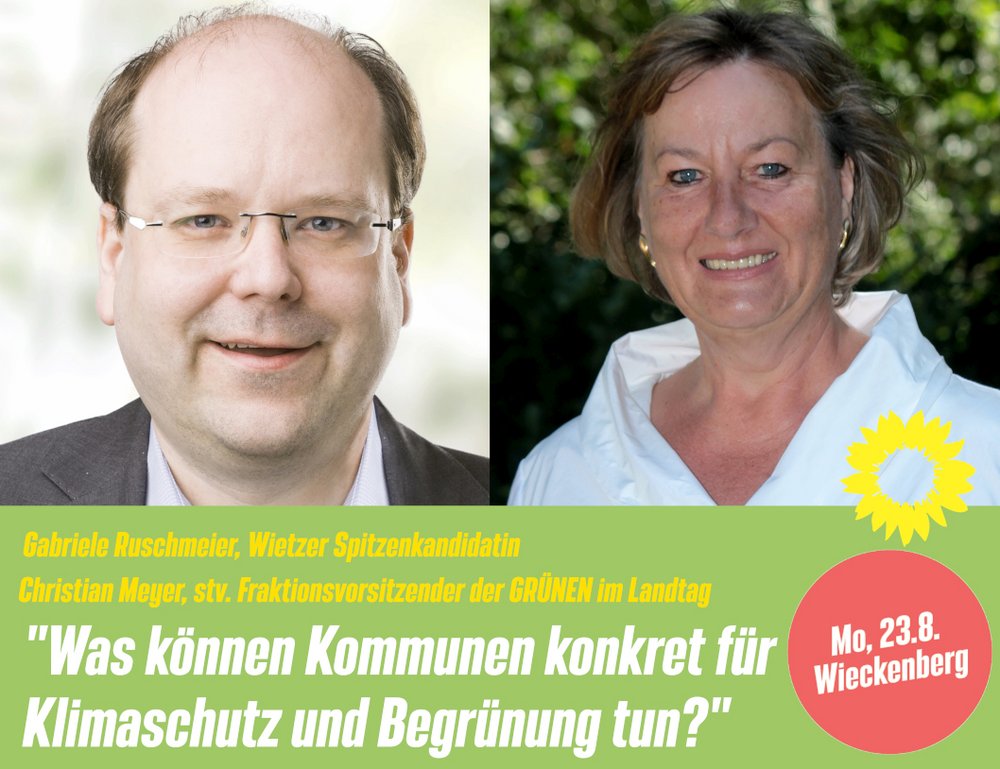 Hochwasser in Deutschland, Waldsterben, Dürre, Artensterben. Was geschieht gerade in Deutschland? Die Wietzer Spitzenkandidatin Gabriele Ruschmeier lädt ein zu einer Diskussion mit Christian Meyer. Meyer, früherer Minister und derzeitiger stellvertretender Fraktionsvorsitzender der GRÜNEN im Landtag, steht seit über zehn Jahren den Wietzer Bürgerinnen und Bürgern regelmäßig Rede und Antwort und berichtet aus dem niedersächsischem Landtag.