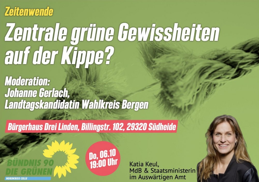Am 6. Oktober 2022 bietet der Ortsverband von Bündnis 90/Die Grünen im Nordkreis Celle um 19:00 Uhr eine Veranstaltung mit dem Thema „Zeitenwende – Zentrale grüne Gewissheiten auf der Kippe?“ an.